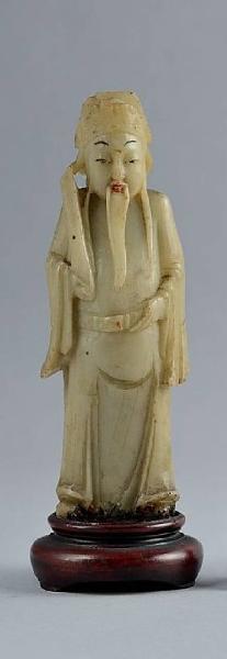 Piccola scultura in pietra saponaria di deità stante con lunga barba, in abiti mandarinali, lunga veste e copricapo, che regge una tavoletta o un bastone (spezzato) nella mano destra e porta la mano sinistra alla cintura. La figura è incollata a una basetta di legno rotonda con tre piedini. La bocca è stata dipinta di rosso, mentre gli occhi e le sopracciglia sono sottolineate in nero.