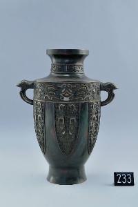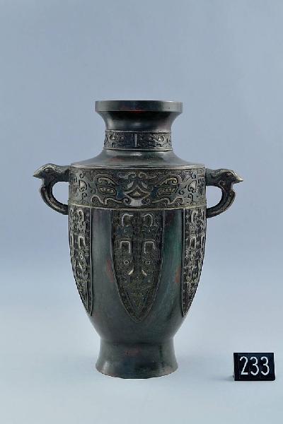 Vaso in bronzo ad anfora con pancia ogivale, basso piede troncoconico, spalla squadrata, breve collo circolare e labbro espanso, verticale. Due piccole anse a occhiello a protome di uccello si trovano all'altezza della spalla. La decorazione, in stile arcaicistico, è realizzata a bassorilievo con intarsi di fili d'argento. Al centro del collo si trova un breve fascia con draghi stilizzati, sotto la spalla una fascia a mascheroni zoomorfi e sulla pancia una teoria di sei motivi a lancetta di cicala stilizzata. Bronzo giallo con patina tendente al verde, con macchie rossastre e tracce di doratura. L'interno è cosparso di colofonia e polvere verde.