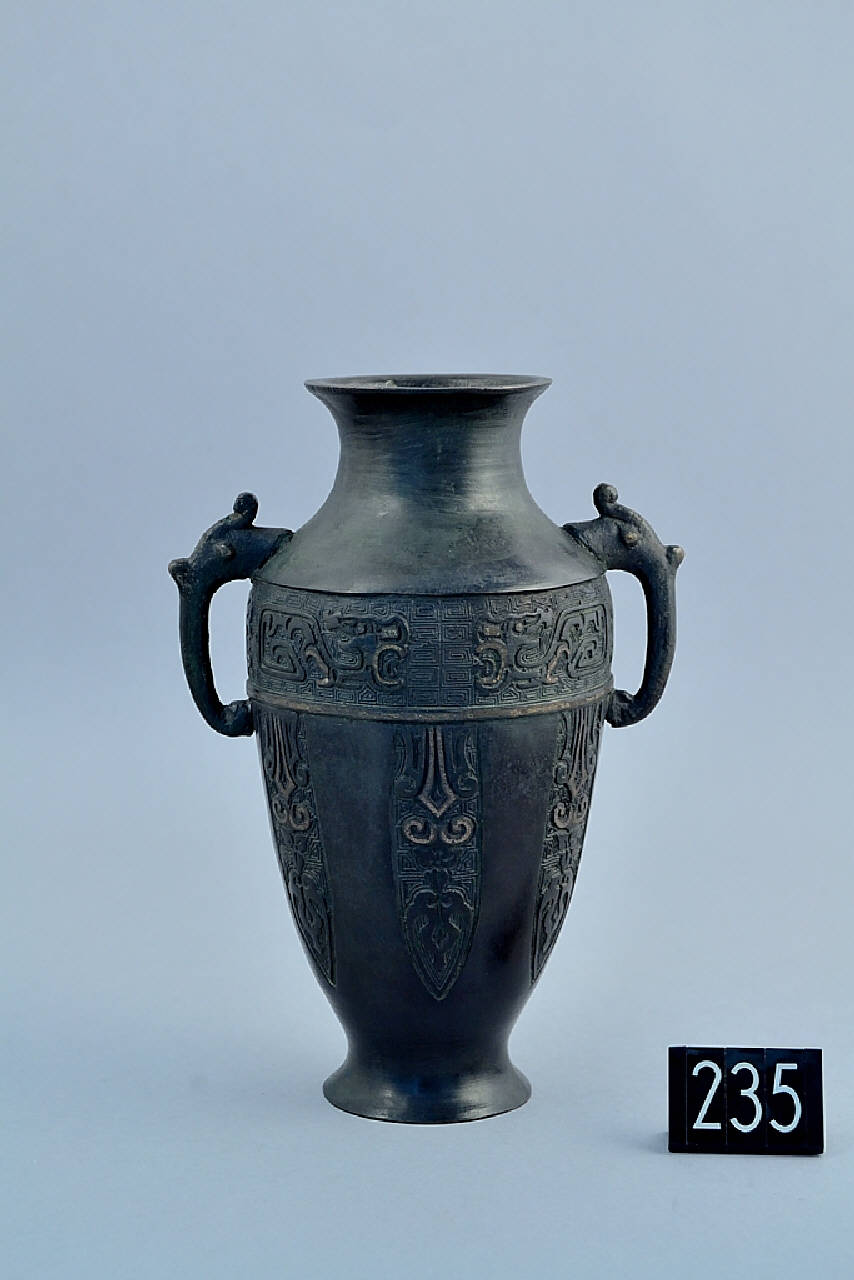 Vaso in bronzo ad anfora con pancia ogivale, basso piede troncoconico, spalla squadrata che prosegue stondata sul collo, breve, terminante a bocca circolare strombata. Due anse a protome di drago sporgono all'altezza della spalla. Sotto la spalla si trova una fascia con draghi stilizzati a bassorilievo e sulla pancia una teoria di motivi a lancetta di cicala stilizzata con intarsi di fili d'argento.