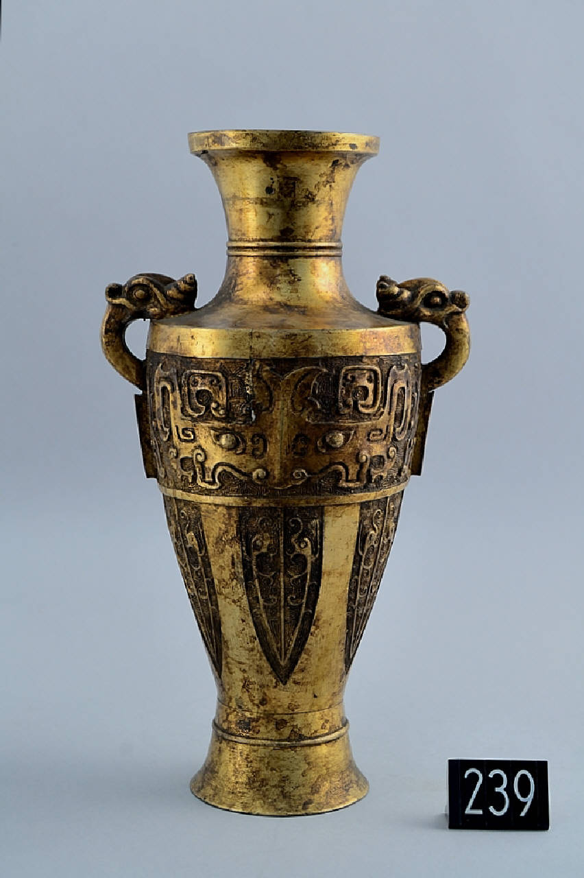 Vaso da fiori in bronzo dorato ad anfora con pancia ogivale, basso piede troncoconico, spalla squadrata che prosegue stondata sul collo, breve, terminante a bocca circolare strombata. Due anse a occhiello formato da protromi di drago sporgono all'altezza della spalla. Sotto la spalla si trova una fascia con mascheroni zoomorfi e subito dopo una teoria di quattro motivi a lancetta di cicala stilizzata. Sotto le anse, due piccole sporgenze squadrate verticali.