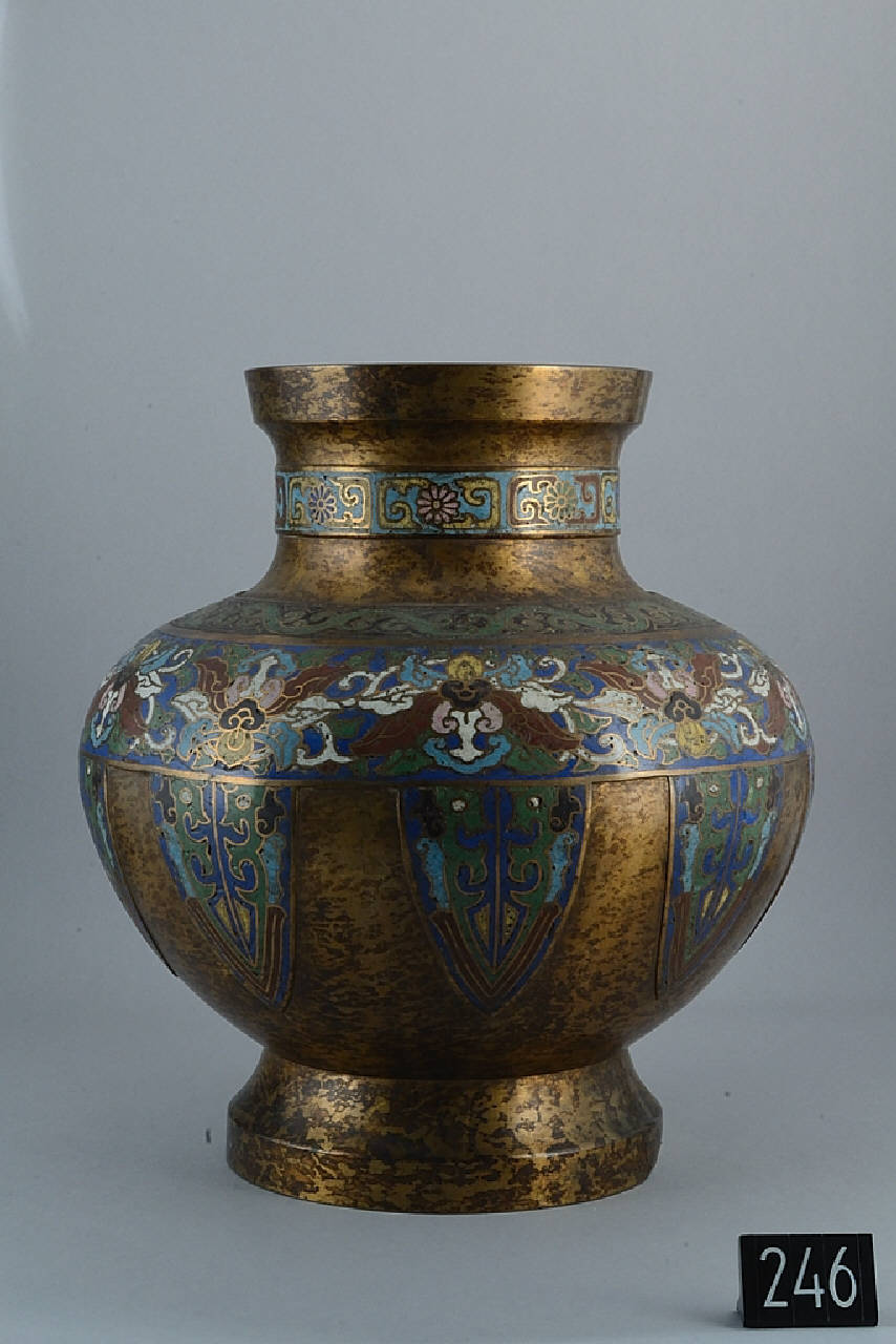 - NOTIZIE STORICO CRITICHE DOPPIO NUMERO DI INVENTARIO: G1080\nBronzo chiaro maculato. Stile cinese. Smalti molto opachi un po' rovinati. Blu, azzurro, bianco, verde, rosso, giallo, rosa, nero leggero.\nEtichetta inventario 1936.\nEtichetta tonda e piccola "29".\nEtichetta tonda: "G N 138".