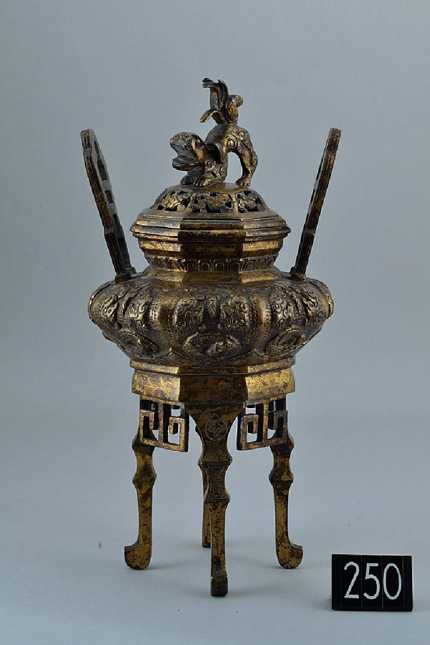 Incensiere tripode in bronzo con coperchio. Lunghi piedi squadrati dal profilo sagomato con terminale incurvato verso l'esterno, uniti a incastro alla base della pancia. Sotto la base, a separare le gambe nel mezzo, pendono tre segmenti squadrati a formare meandri geometrici. Il corpo, a pianta ottagonale, è si presenta molto espanso e schiacciato a i poli, con una spalla alta sulla quale si trovano le due lunghe prese traforate, inclinate rispetto al piano verticale e sagomate secondo un profilo polilobato. Sulla bocca, leggermente espansa, si appoggia un coperchio a calotta traforato al centro e sormontato da un pomello a forma di leoncino cinese. La superficie, dorata a fuoco, è decorata a rilievo di nuvole sul ventre e petali di loto stilizzati attorno al collo. In coppia e uguale a C249.