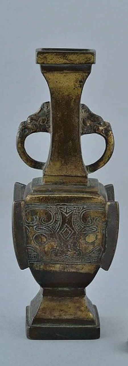 Vasetto in bronzo dorato a pianta quadrangolare, con piede tronco piramidale scalonato, pancia espansa e spalla alta che conduce a un lungo collo terminante a bocca quadrata strombata. con decorazione incisa di taotie. Due anse a occhiello con proptrome di drago si trovano a metà del collo. La pancia è decorata con motivi incisi di mascheroni stilizzati e ai vertici con costolature verticali in stile arcaizzante.