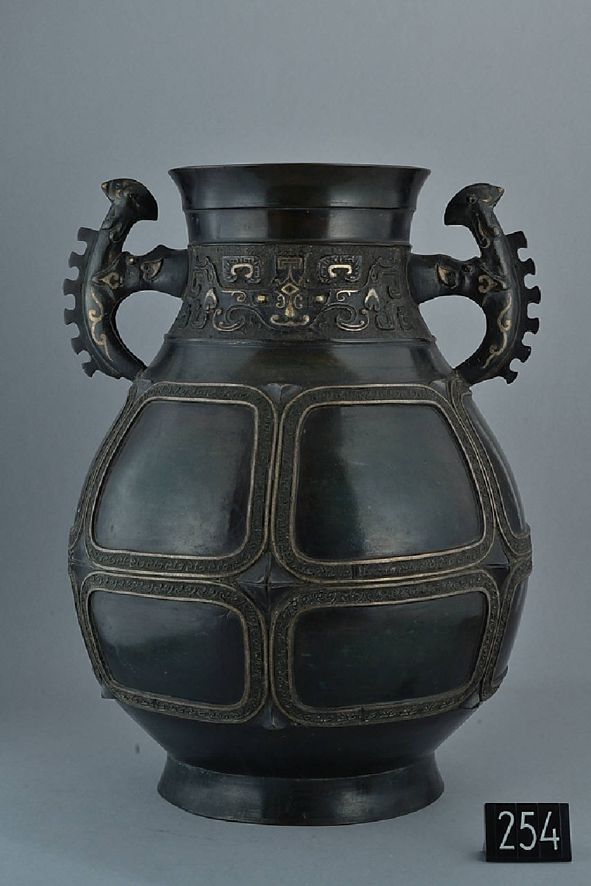 Grande vaso in bronzo decorato a intarsi d'argento. basso piede troncoconico, ampia e bassa pancia con spalla obliqua che si rastrema al collo, breve e strombato, terminante a bordo obliquo. All'altezza del collo sporgono due prese a forma di draghi rampanti molto stilizzati. La pancia è decorata a contorni rilevati che creano comparti rettangolari dai bordi stondati e stelle rombaloidi a rilievo fra di essi. Sul collo, all'altezza dei manici, si trova una decorazione incisa e ageminata a motivo di mascherone arcaicistico. La patina è scura, con striature verde scuro.