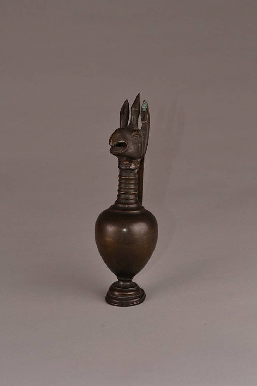Pastiche costituito da una piccola anfora con collo a torciglione alla quale è stata saldata una testa d'animale con due orecchie dritte e un corno centrale più alto e un'ansa posteriore dal profilo dritto. Bronzo chiaro.