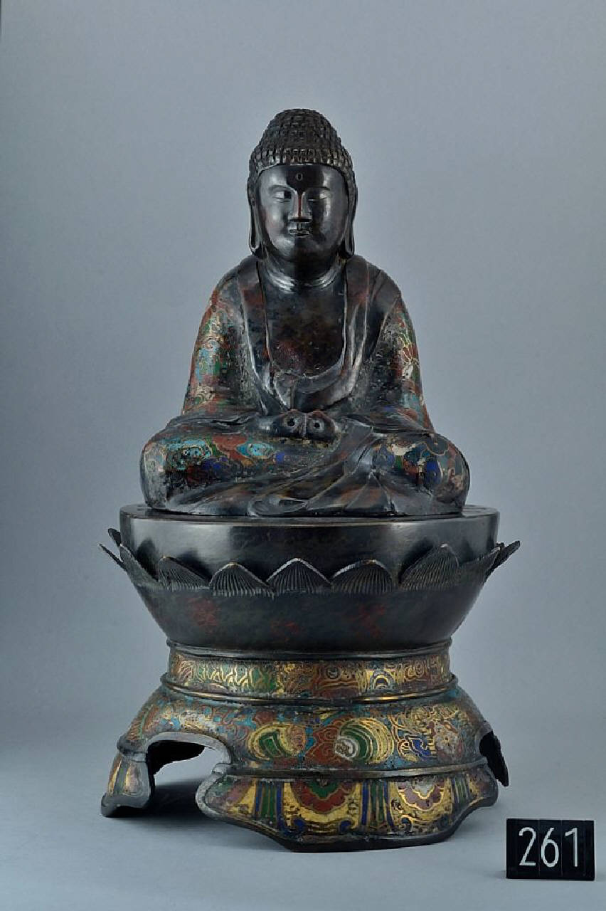 Statua in bronzo decorato a smalti champlevé (nei colori giallo, verde, azzurro, blu, bianco, rosso) di buddha Amida (Amitabha) assiso nella posizione del loto su un trono di loto circolare con piedistallo modanato. La statua è realizzata separatamente dal pideistallo, che è cavo.