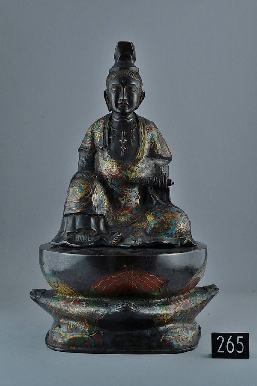 Statua in bronzo decorato a smalti champlevé (nei colori giallo, verde, azzurro, blu, bianco, rosso) di bodhisattva Kannon (Avalokitesvara) assiso con il ginocchio destro alzato e un rotolo nella mano sinistra. La statua è realizzata separatamente dal trono di loto, che è cavo e fa corpo con un piedistallo modanato. Patina scura.