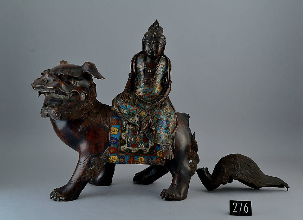 Statua in bronzo e smalti champlevé di Monju bosatsu (il bodhisattva Manjusri) tipicamente raffigurato seduto sul suo leone.