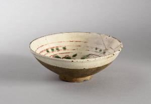 Ciotola o piattino fondo a decoro rosso ferro. La ciotola è smaltata e internamente decorata a cerchi rossi concentrici entro i quali compaiono quattro serie di puntini verdi che distinguono la tipologia. Sul fondo foglie rosse e verdi. Esternamente non verniciato, con sbavature di smalto.