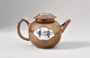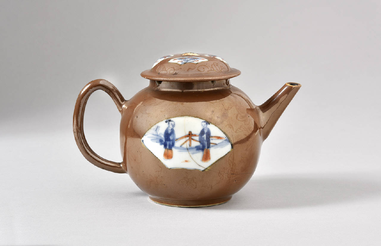 Teiera con coperchio. Invetriatura marrone con due riserce a ventaglio entro le quali sono disegnate due persone in blu sottocoperta e smalto rosso sopracoperta. Sul coperchi, quattro riserve a ventaglio con decoro floreale nella medesima tecnica.