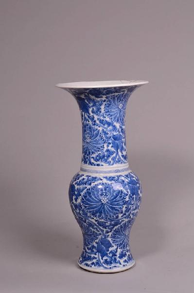 Grande vaso a "coda di fenice"in porcellana bianca e blu con decorazione di fiori di loto, su tutta la superficie.