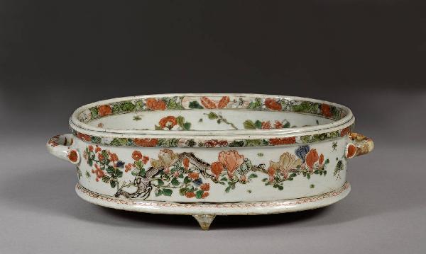 Terrina di forma ovale con alto bordo dal cui centro si protraggono due anse. È sorretto da tre piedini a cono. Porcellana spessa con spessa vetrina bianca decorata a smalti in Famiglia Verde rossi e verdi sopracoperta con motivo di uccelli, farfalle e di pruno.