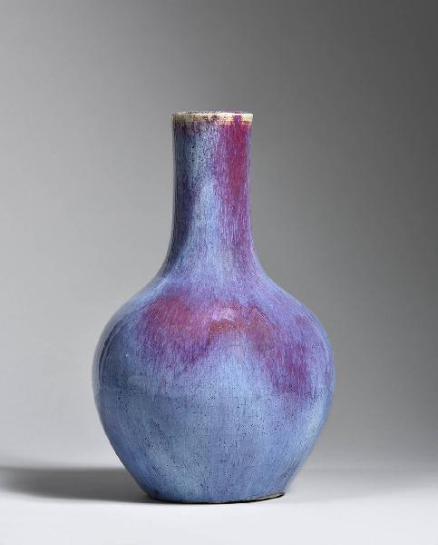 Grosso vaso a bottiglia in porcellana spessa e pesante con invetriatura flambé, vetrosa, azzurra e rossa striata di bianco.