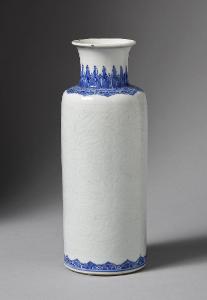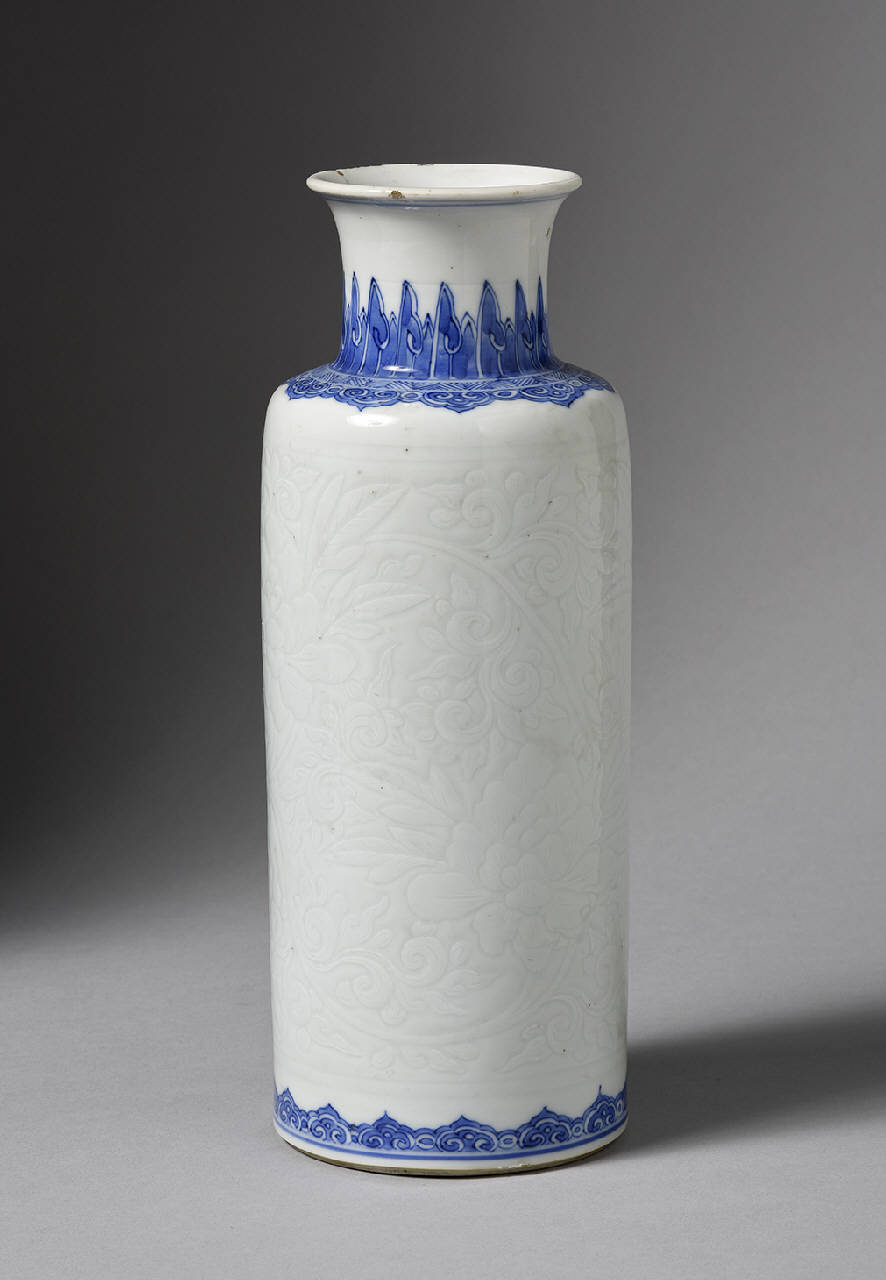 Vaso cilindrico, a bocca leggermente espansa, in porcellana bianca e blu. La decorazione in blu sottocoperta si ritrova fra spalla e collo e sul piede. Il corpo del vaso è inciso a motivo di fiori di peonia. Sotto, doppio cerchio blu. Come C398.