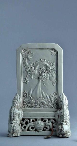 Schermo da tavolo per la scrittura a una sola facciata. Il basamento è formato ai lati da due leoni cinesi a testa in giù e in centro da una fascia traforata con semisfera centrale. Sulla parte centrale dello schermo una raffigurazione a bassorilievo di drago che dal cielo soffia su un altro drago in acqua.