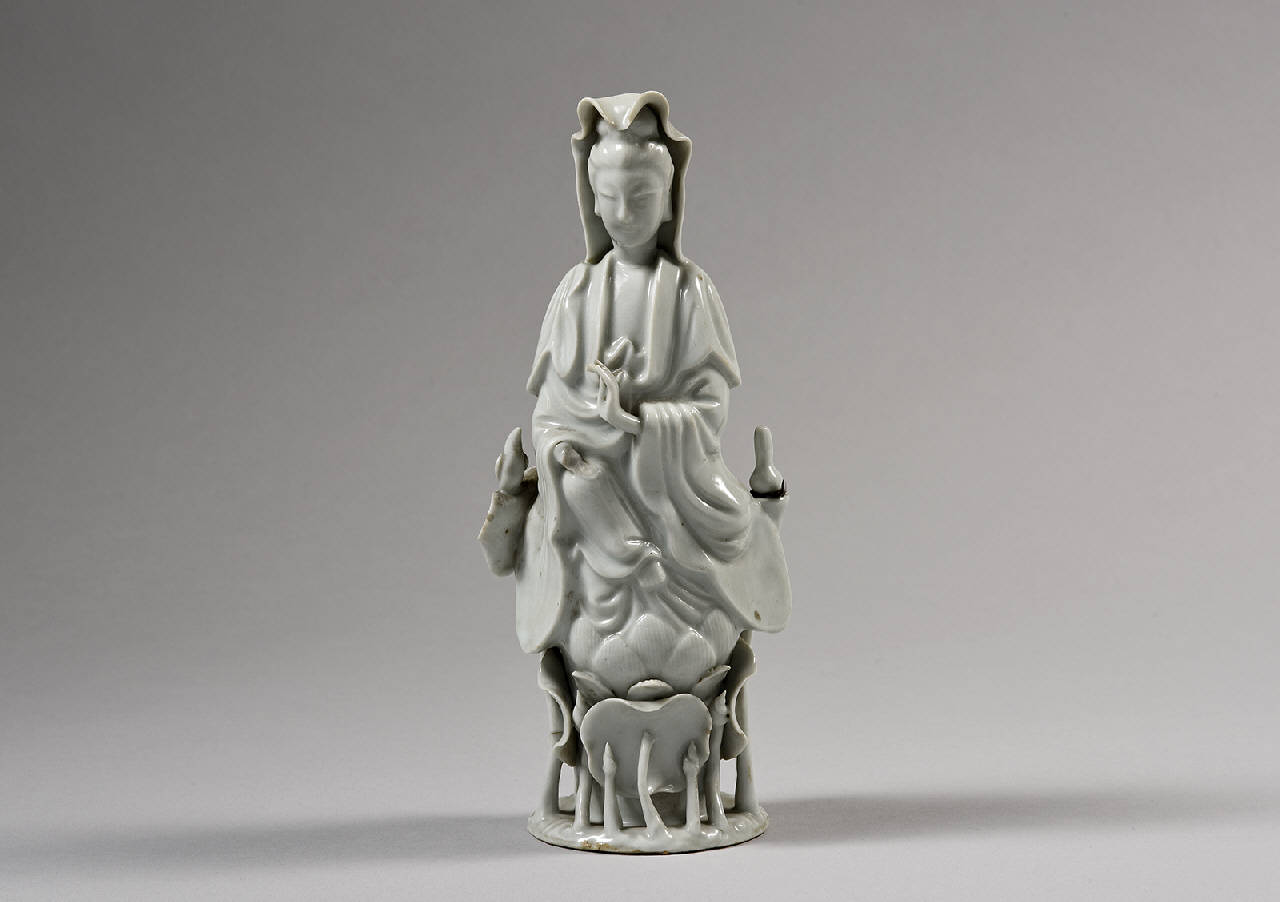 Guanyin su fior di loto, fra piante acquatiche. Il bodhisattva è raffigurato con un fanciullo fra le mani (mancante). Alla sua sinistra la fiaschetta amrita e alla sua destra una colomba (?).\nI capelli e il loto sono decorati con leggero intaglio sotto coperta.