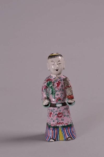 Famiglia rosa, falangcai. Statuetta di bambino in porcellana. Nella mano destra ha tre fiori di loto. Il primo è a bociolo, il secondo è aperto e il terzo è aperto completamente. Nella destra regge uno strumento musicale a canne, l'armonica a bocca "cheng". Il vestito è rosa con ornato floreale. Il fondo del vestito è a strisce blu e rosa con spacco centrale in giallo e fascia superiore verde a motivo dell' erba. All'interno un sonaglio.