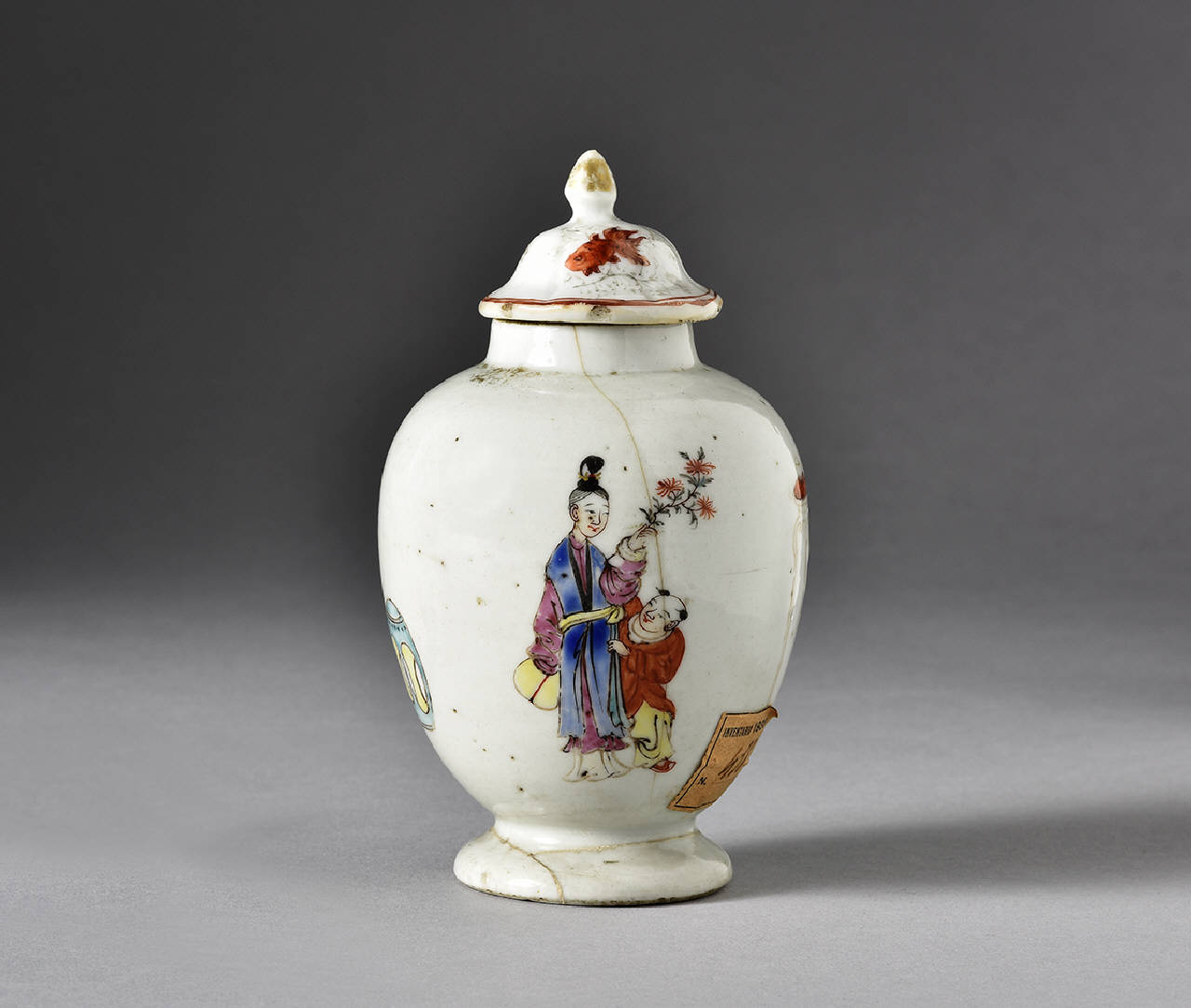 Piccola giara con coperchio dal profilo modanato e pomolo in porcellana Famiglia Rosa. Decoro con figura di donna con bambino e letterato al tavolo degli studi. Sul coperchio due carpe.