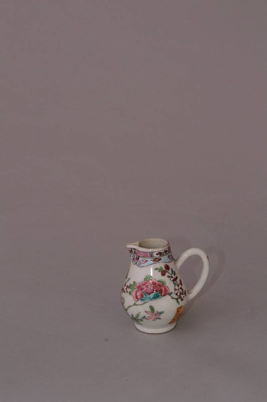 Famiglia rosa, fencai. Piccola brocca in porcellana con smalti sopracoperta blu, verde, rosa, bianco, azzurro decorata con motivi floreali.