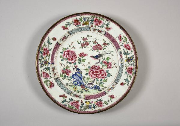 Grande piatto in porcellana a smalti Famiglia Rosa con decoro centraledi coppia di fenici tra rocce ornametali e rami in fiore, con orlo e fascia interna a motivi geometrici, il bordo con fascia metallica.