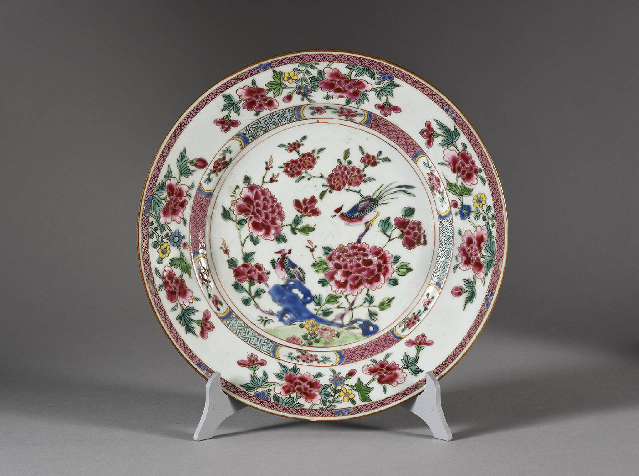Piatto in porcellana a smalti Famiglia Rosa con decoro centraledi coppia di fenici tra rocce ornametali e rami in fiore, con orlo e fascia interna a motivi geometrici.