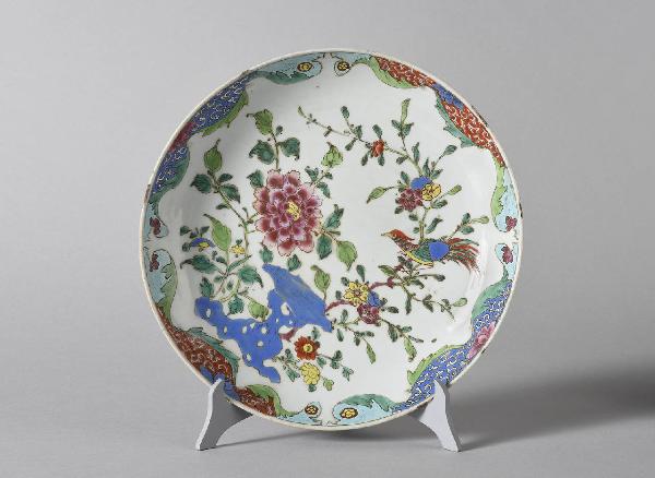 Piatto in porcellana con smalti policromi sopracoperta. Il decoro principale è costituito da una peonia che cresce vicino a una roccia e un albero di pruno con sopra un uccello dal piumaggio lungo e colorato. Lungo tutto il bordo una decorazione di foglie riverse con all'interno tralci e fiori di diversi colori. Sotto, due cerchi concentrici in blu sottocoperta.