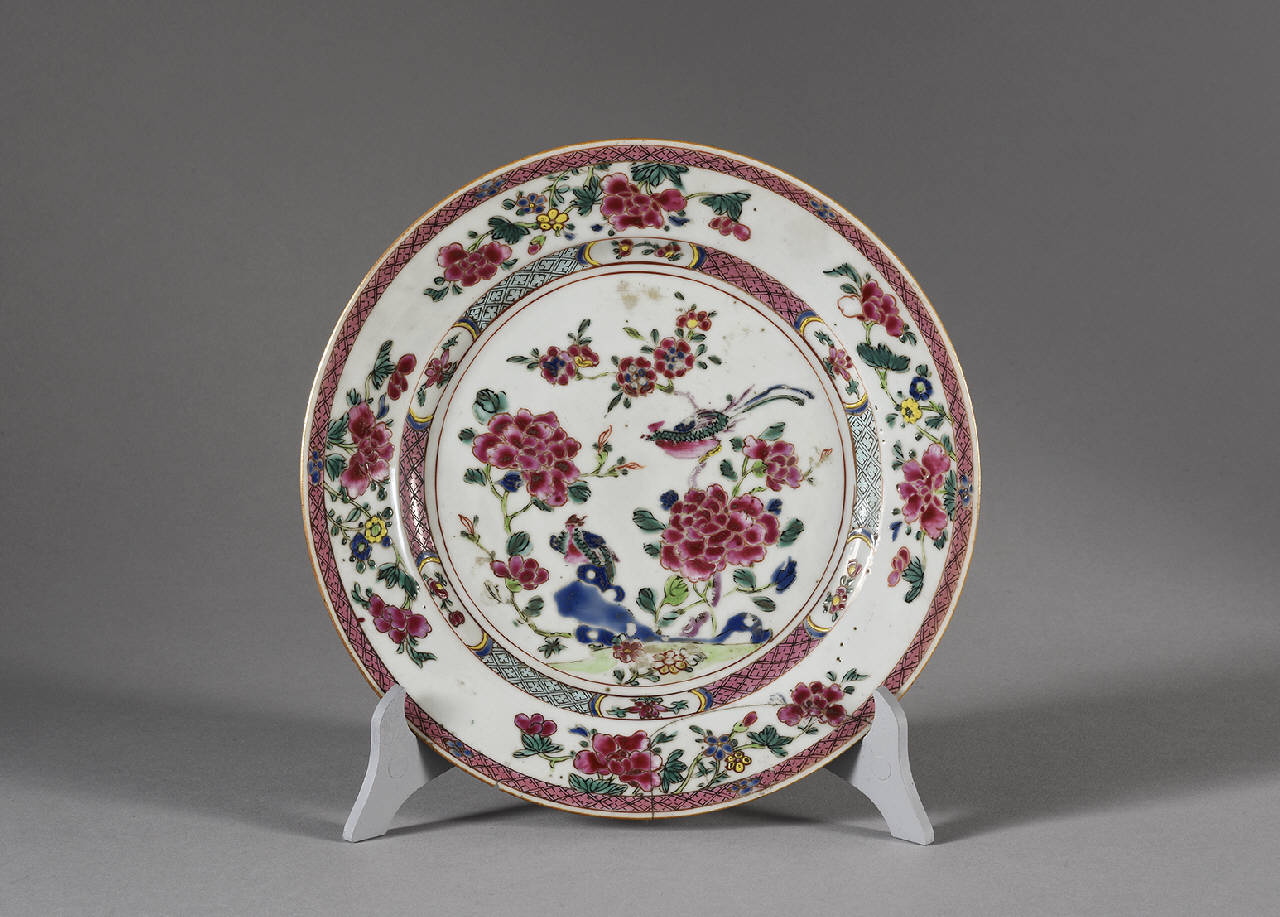 Piatto in porcellana a smalti Famiglia Rosa con decoro centraledi coppia di fenici tra rocce ornametali e rami in fiore, con orlo e fascia interna a motivi geometrici.