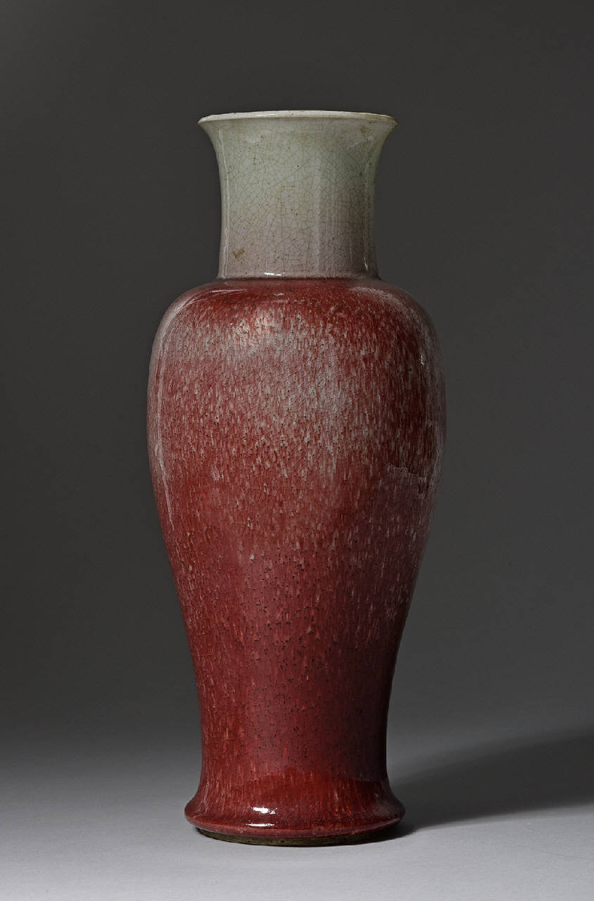 Vaso a balaustro, rastremato in basso, collo più stretto e labbro leggermente espanso. Invetriatura traslucida craquelè a striature rosse sottocoperta su base bianca.