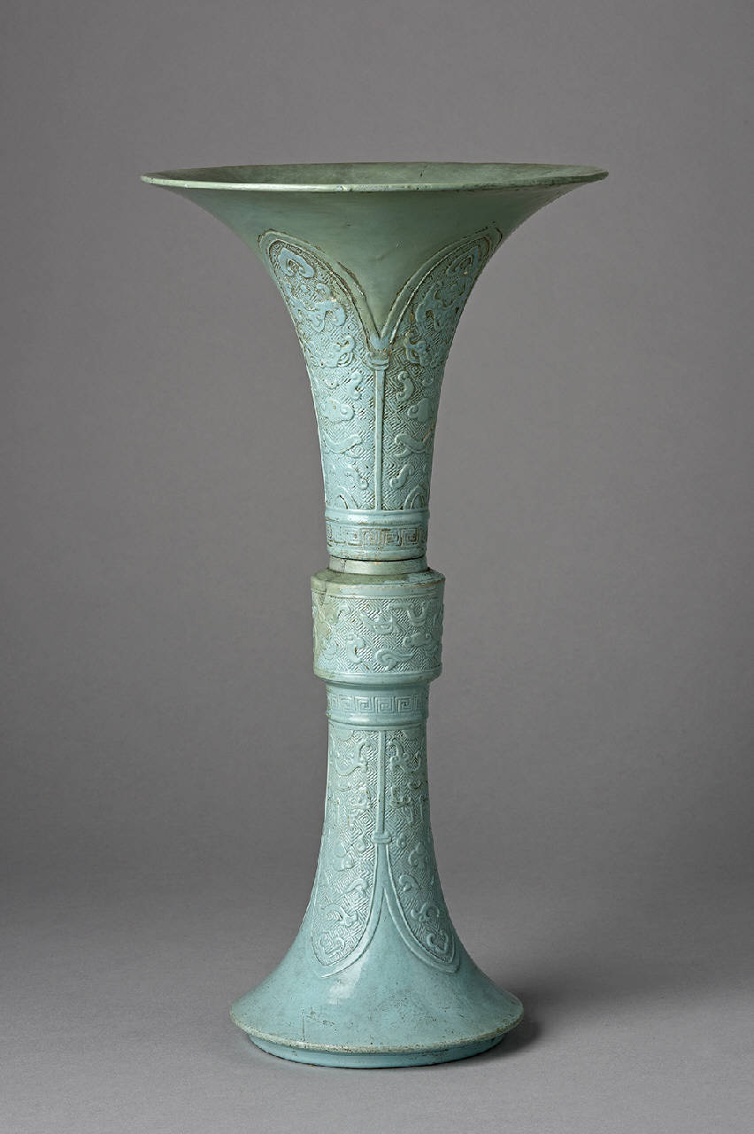 Vaso in porcellana bianca ricoperto da smalto azzurro, in due sezioni ad incastro. La forma dal piede a tromba, fascia centrale in rilievo e bocca espansa a campana, imita i bronzi di tipo arcaico gu. Le due parti si uniscono all'altezza della fascia centrale. Il decoro in rilievo composto da motivi arcaici su fondo a decoro geometrico.