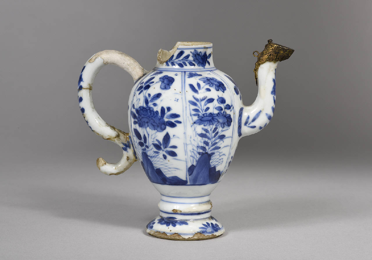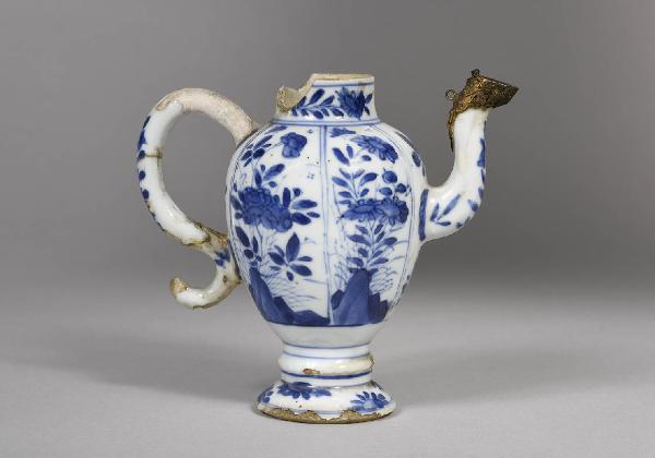 Piccola brocca ovoidale con alto piede, manico a S e lungo beccuccio curvo in porcellana bianca e blu terminante in un rinforzo in ottone con cerniere per il coperchietto (mancante).