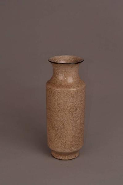 Vaso a rullo con basso piede rientrante , breve collo convesso e bocca leggermente espansa. In porcellana con coperta marroncina a fine craqueleur. Il bordo della bocca è marrone. Alla base marchio a due caratteri in blu sottocoperta, coperti dalle etichette. Come C491.