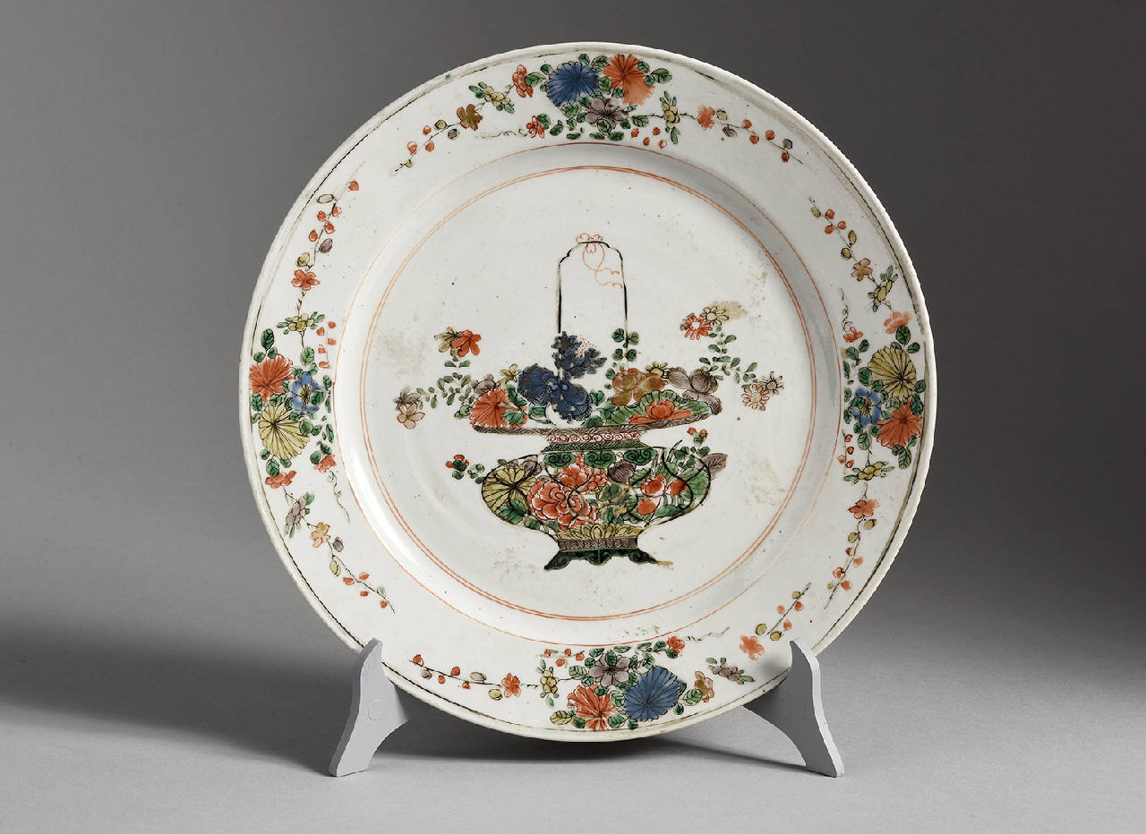 Famiglia Verde. Piatto in porcellana con decoro a smalti sopracoperta di vaso fiorito. Sulla tesa quattro gruppi fioriti con crisantemi e susini. Sul fondo, marca in blu sottocoperta entro due cerchi concentrici. Come C504.