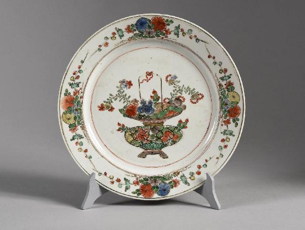 Famiglia Verde. Piatto in porcellana con decoro a smalti sopracoperta di vaso fiorito. Sulla tesa quattro gruppi fioriti con crisantemi e susini. Sul fondo, marca in blu sottocoperta. Entro due cerchi concentrici. Come C503