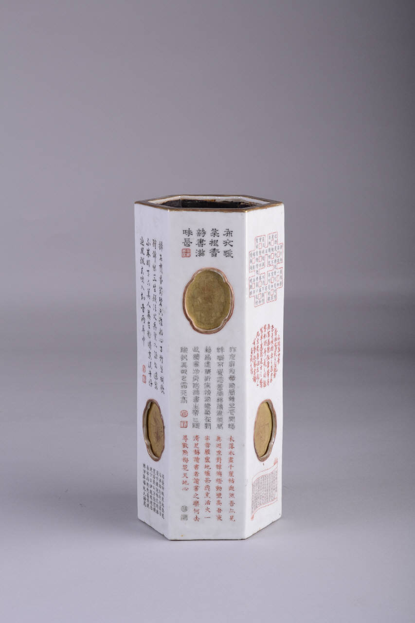 Sostegno per cappello, a forma di vaso esagonale in porcellana bianca con decoro di caratteri cinesi in scrittura antica e moderna in smalti neri e rosso sopracoperta su tutte le facce. Su ogni faccia un'apertura quadrilobata posta alternativamente in alto e in basso, lascia intravvedere la ricopertura interna in legno dorato.\nI bordi sono dorati, l'interno in legno è leggermente laccato di nero. Diversi sigilli vicino alle scritte. Alla base marchio a quattro caratteri in rosso ferro "bingshen hao zao" (fatto nella bottega di Bingsheng)