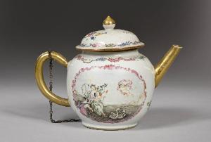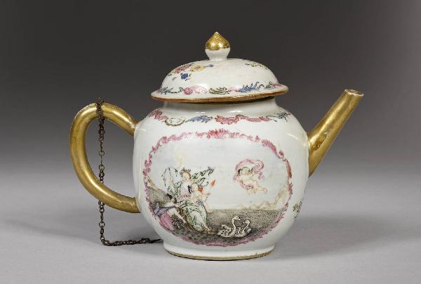 Familglia Rosa con dettagli en-grisaille Chine de commande. Teiera in stile occidentale con coperchio tenuto a una catenella legata al manico. Beccuccio e manico dorati. Sui due lati, in una riserva bordata di rosa, sono raffigurati Afrodite Pontia che tiene in braccio Eros con la fiaccola accesa. I due sono su una conchiglia che, come un carro, viene trainata in acqua da due cigni. A fianco, un tritone muove le pale di una ruota esterna alla conchiglia. In alto a destra, un putto in volo.