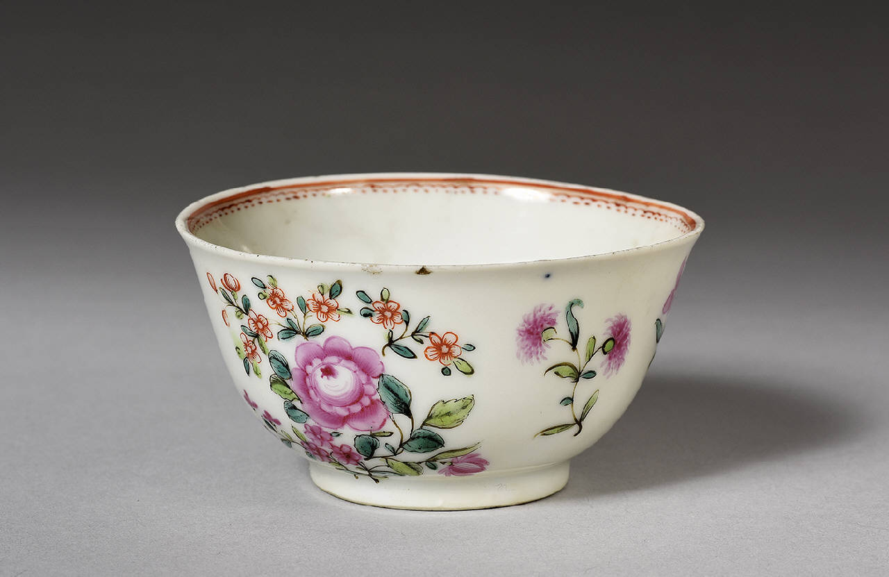 Tazzina in porcellana a smalti policromi con decoro a fiorellini rosa. All'interno dell'orlo fascia di linee in rosso. Un fiorellino rosso sul fondo.