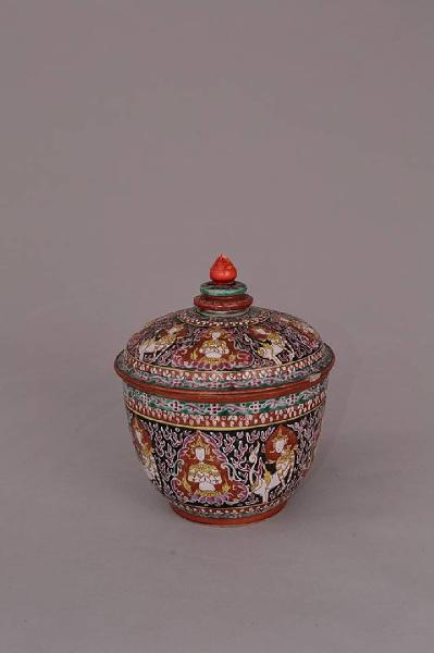 Vaso bacheng a forma di profonda ciotola con coperchio a campana, del tipo bencharong (a cinque colori) con raffigurazione dello spirito Nora Singh e angeli thepanon.