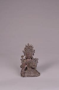 Scultura in bronzo raffigurante Guanyin (Avalokitesvara). Sulla spalla un attributo spezzato. Seduta nella posizione del loto padmasana, con la mano destra compie il gesto di garanzia dell'esaudimento dei desideri varadamudra e con la sinistra quello dell'esposizione della dottrina vitarkamudra.