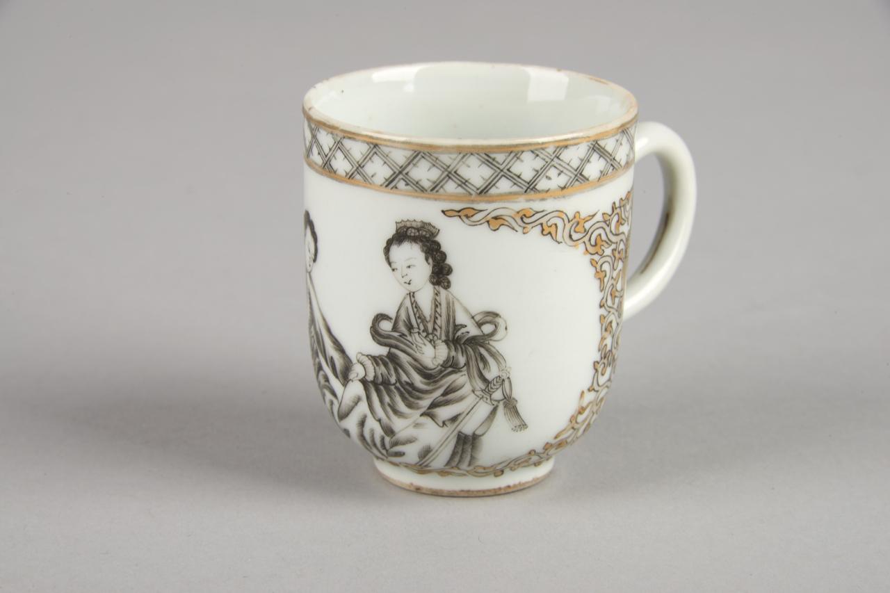 Grisaille. Encre de Chine e oro. Tazzina da caffè raffigurante due figure di occidentali, probabilmente olandesi, che si scambiano gli anelli.
