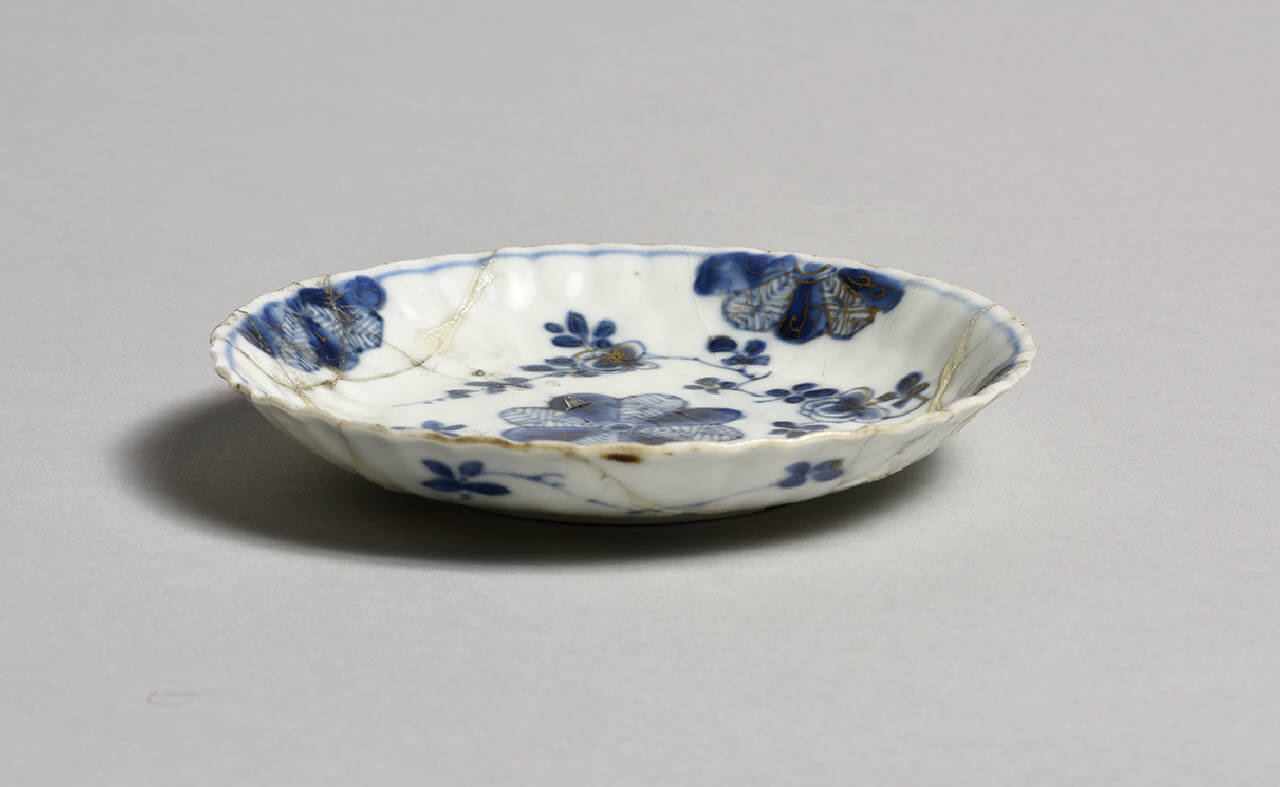 Piattino bianco blu con dorature. Il decoro è costituito da un fiore al centro e altre quattro metà disposte lungo i bordi. Altri fiorellini più piccoli attorno al fiore centrale.