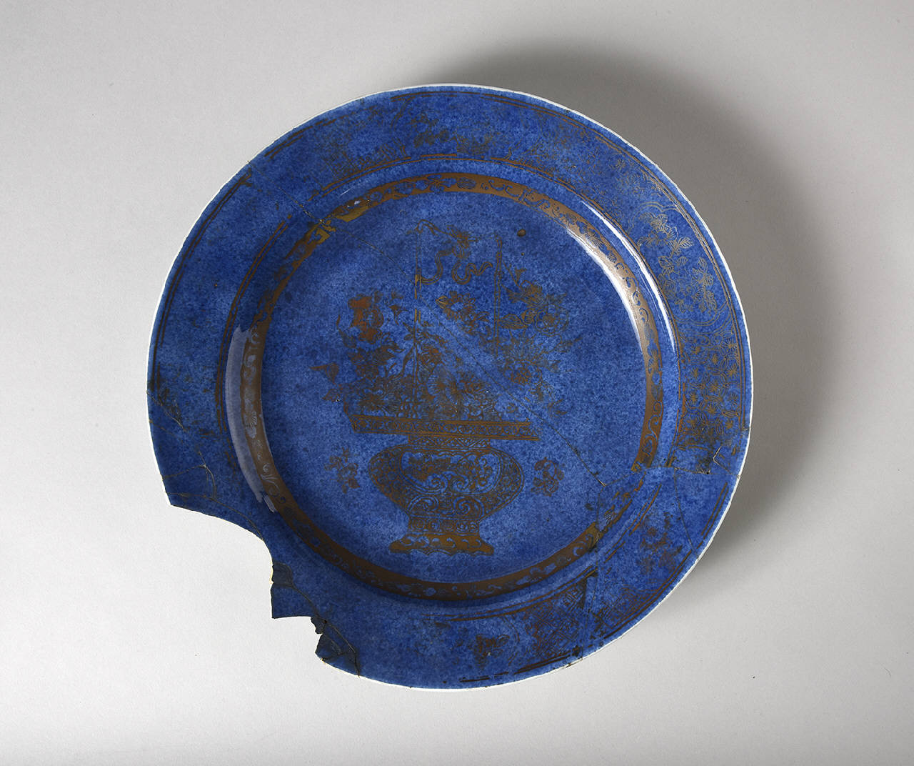 Grande piatto a fondo blu soffiato con decoro in oro di vaso con fiori e diverse fasce con decoro floreale, lungo la tesa. Sul rovescio, fiori lungo la tesa e al centro marca in blu sottocoperta di gioiello romboidale entro due cerchi concentrici.