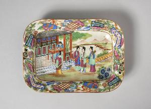 Vassoio fondo di forma rettangolare con decorazione centrale a smalti sopracoperta nello stile Famiglia Rosa cantonese di donne con ventaglio in un giardino e uomo al tavolo degli studi. Sulla tesa i "cento oggetti antichi". Sul verso una fascia non invetriata.