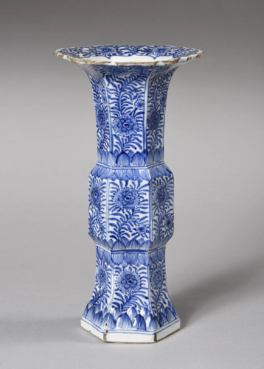 - NOTIZIE STORICO CRITICHE Costituisce una "garniture de cheminé" con C659, C660, C665.\nLa garnitura a cinque pezzi, il più delle volte composta con la configurazione di due vasi a tromba e tre vasi a balaustro con coperchio, è considerata un classico della porcellana cinese d'esportazione, a partire dalla fine del XVII secolo. David S. Howard scrive che "è chiaro dall'esame di questo carico del 1695 che la parte più importante erano vasi e garniture" (Choice of the private trader, pag. 236 ). Benché rapidamente adottato per la decorazione delle case europee alla moda e certamente molto popolare durante tutto il periodo d¿oro del commercio cinese, la garnitura a cinque pezzi deriva in realtà direttamente da un prototipo autoctono cinese. Ogni famiglia benestante in Cina aveva certamente nella propria abitazione un altare o un mobile impreziosito da una garnitura di cinque pezzi in porcellana, cloisonné o bronzo. Questi set erano di solito composti da un incensiere con coperchio in posizione centrale, una coppia di portacandele ai lati e da una coppia di vasi di forma gu, in posizione esterna. Un set di questa grandezza poteva essere collocato sulla mensola di un camino, mentre garniture dalle misure più massicce erano destinate a casa molto prestigiose, in cui le garniture erano esposte sul pavimento davanti al camino, oppure su mobili particolarmente imponenti. Esempi di garniture provenienti da musei collezioni private sono stati esposti al Victoria and Albert Museum di Londra durante la mostra Garnitures: Vase Sets from National Trust Houses 11 ottobre 2016-30 aprile 2017 (https://www.vam.ac.uk/exhibitions/garnitures#intro).(Mazzeo 2018)