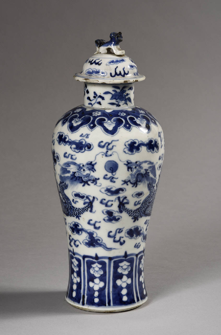 Vaso a a balustrocon coperchio dal pomolo a forma di leone budhdista, in porcelllana bianca e blu, con decorazione di draghi a cinque artigli, affrontati, che inseguono la perla sacra. Come C668.