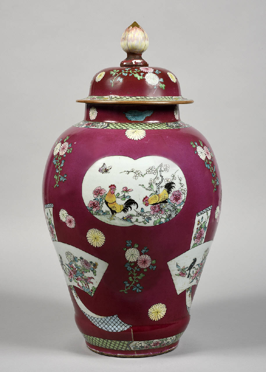 Grande vaso panciuto dalla spalla alta in porcellana decorato in smalti Famiglia Rosa con coppie di galletti gongji e motivi floreali riserve ovali e sagomate su fondo color rubino impreziosito da crisantemi,ju. il coperchio con pomolo a guisa di fiore di loto con decoro simile, bordato da banda a motivi geometrici verde chiaro con ulteriori decori a fiori che riprende il decoro al collo del vaso.