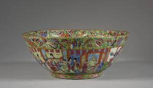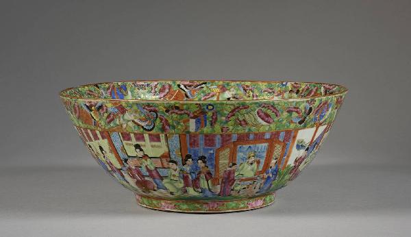 Ciotola da punch in porcellana a smalti sopracoperta Famiglia Rosa cantonese, decorata al centro e all'interno con scene di dame e ufficiali in padiglioni e terrazze alternate a cornici con fiori, bordate da fitti motivi floreali con farfalle in volo su fondo dorato, l'esterno con scena continua dello stesso decoro.