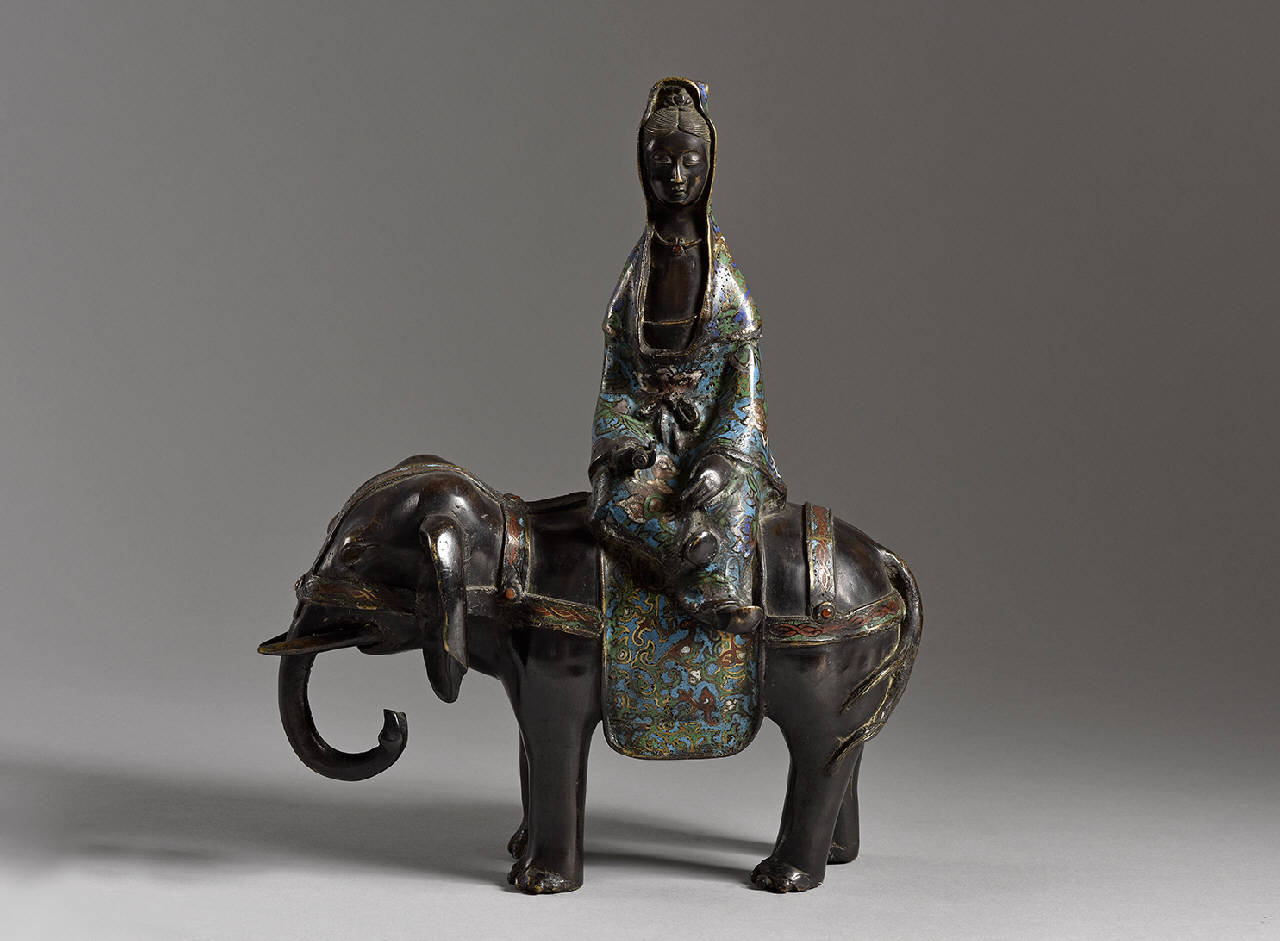 Statua in bronzo di figura femminile con velo in testa seduta da un lato sulla groppa di un elefante. Sigillo a quattro caratteri. Smalti champlevè verde, rosso, azzurro, blu, bianco.