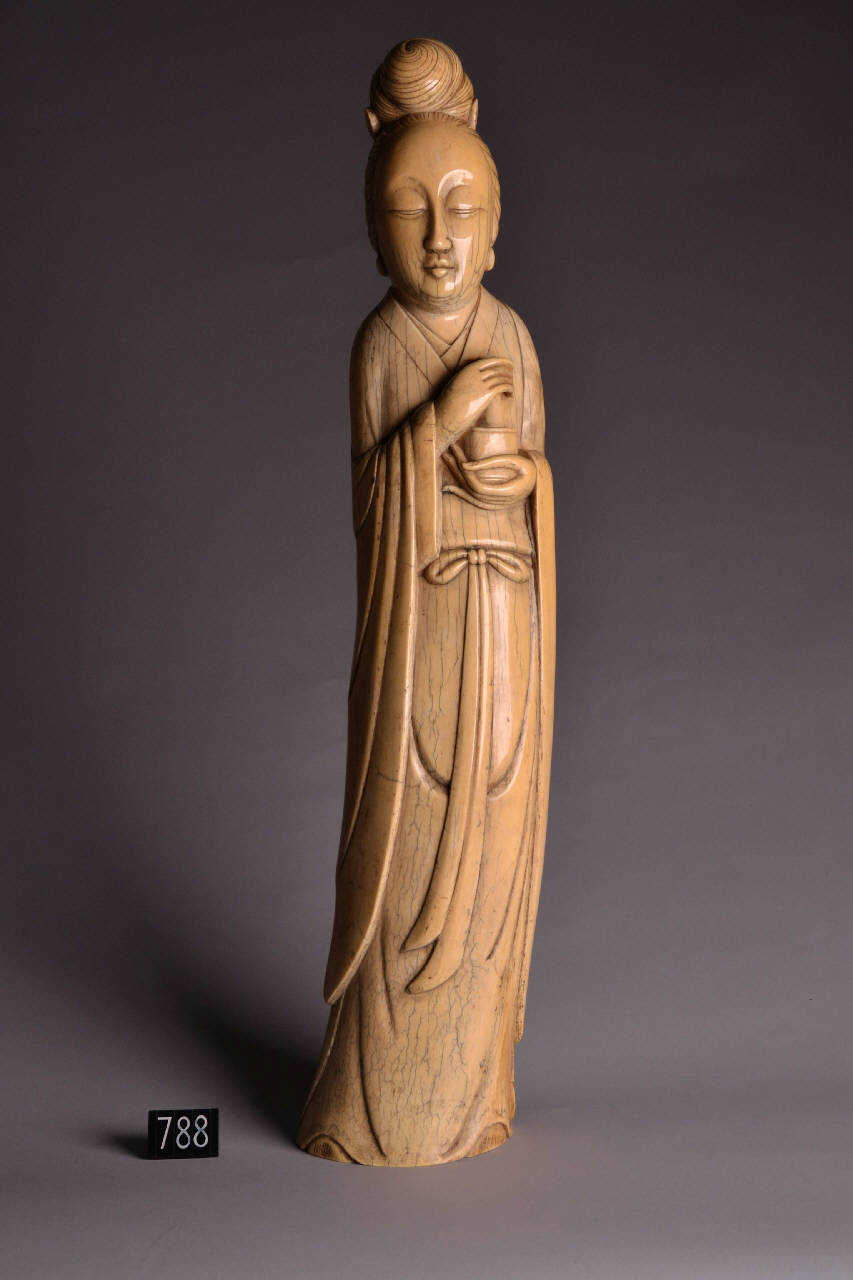 - NOTIZIE STORICO CRITICHE Dalla scheda: "Scultura in avorio nello stile degli intagliatori d'avorio di Pechino. Grande figura femminile in avorio notevolmente massiccia e pesante ricavata quasi certamente da una enorme zanna di elefante indiano. Rappresenta una servente di palazzo o una dama offertrice. Modellazione molto semplice e perfetta. Tardo periodo Ming (1590 - 1620 c.). Fotografia allegata alla perizia del 5 aprile 1973 del dott. Oscar Luzzatto Bilitz".\nLa figura sembrerebbe una dama di corte, ma potrebbe anche essere una figura popolare di dea. Le dimensioni rispecchiano lo standard del periodo Ming, ma l'intaglio raffinato, la patina chiara e il viso leggermente paffuto potrebbero essere il segno di una produzione più tarda. Sul retro, un gran numero di crepe si dirama in senso orizzontale. \nRegistro d'ingresso n. 371 A.