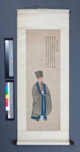 Rotolo dipinto a inchiostro e colori su carta, raffigurante in basso a sinistra il poeta Su Dongpo stante, di tre quarti, con ampia veste grigia con orli blu e alto cappello. Le mani sono unite frontalmente e nascoste nelle maniche. In alto a destra si trova il titolo del dipinto seguito da un'iscrizione di 95 caratteri che termina con una firma a tre caratteri del calligrafo e due sigilli in rosso con caratteri in negativo. In basso a destra un sigillo in rosso con nove caratteri in positivo.