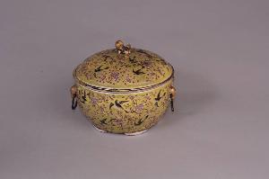 Scaldavivande in porcellana con maniglie pendenti in metallo, basso piede diviso in quattro parti modanate e coperchio con pomello a forma di cane di Fo. Decoro con motivo di gazze tra fiori di pruno rosa su fondo giallo. Contiene all'interno una ciotola con bordo dorato. Entrambe con marchio Guangxu in rosso ferro a quattro caratteri e del periodo.
